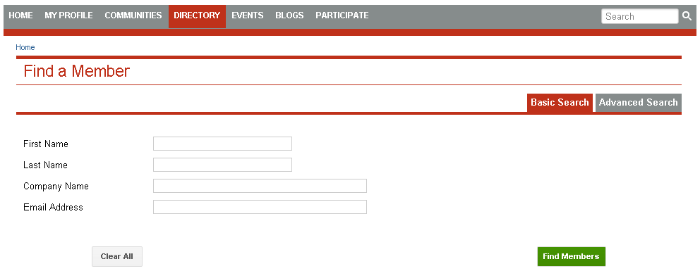 Finding fellow members is simple. Click the Directory tab at the top of the screen to search for fellow members using their First or Last Name, Company Name, or Email Address. For more in-depth searches, use the Advanced Search tool.