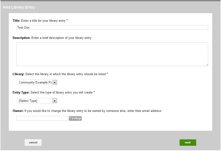 document button you will open the Add Library Entry screen. Selecting the Entry Type will allow you to upload document files, hyperlinks to website, Youtube videos, and webinars.