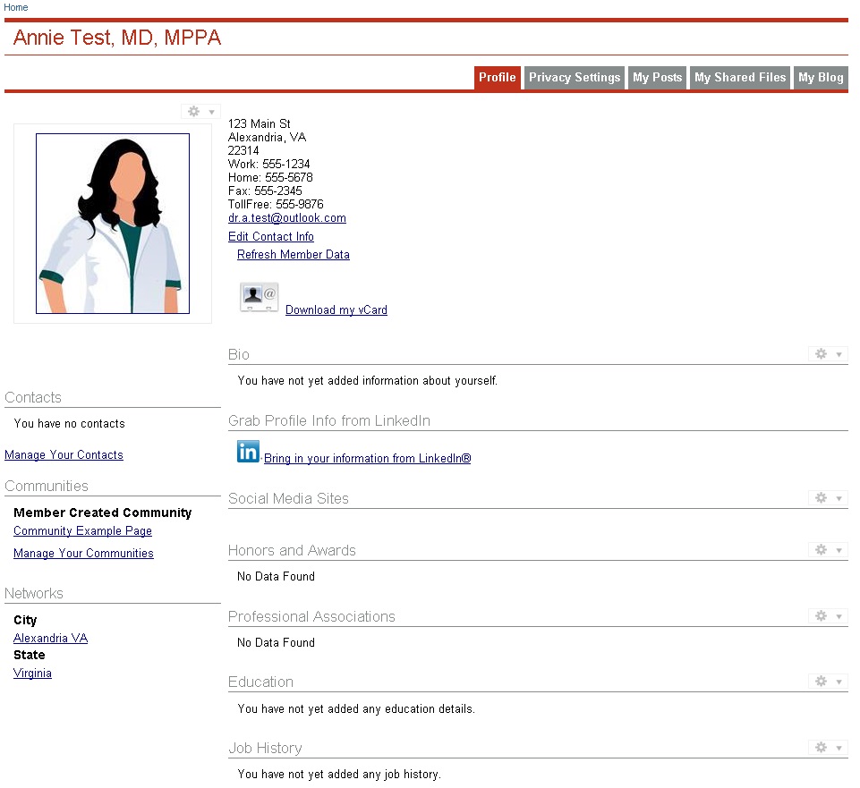Your profile screen will be the main stop to manage your account for ENTConnect. From here you will be able to manage your privacy settings, update your profile, contacts, and communities, and review past posts, files, and blogs.