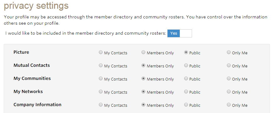 Select from My Contacts, Members Only, Public, or Only Me for each item on your profile and then click save.
